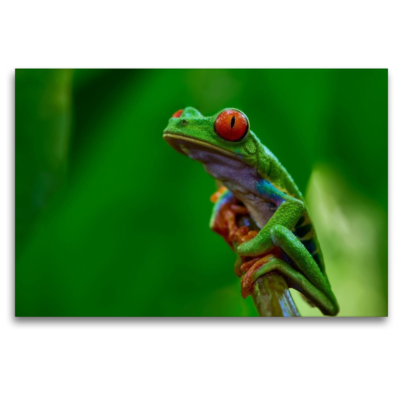 Mit seinen leuchtend roten Augen, dem satten Blattgrün und den farbenfrohen Details gehört der Rotaugenlaubfrosch zu den spektakulärsten Bewohnern der tropischen Regenwälder Mittelamerikas. Dieses beeindruckende Naturmotiv zeigt den kleinen Frosch in einer typischen Ruhepose auf einem Blatt – wachsam, elegant und voller exotischer Ausstrahlung. Die intensive Farbpalette und die faszinierende Nähe zum Tier machen dieses Motiv zu einem echten Blickfang. Naturfreunde, Tierliebhaber und Puzzlefans holen sich damit ein Stück tropische Wildnis direkt nach Hause. Ob als hochwertiger Druck oder als Puzzle: Das Motiv begeistert mit seiner Detailfülle, der lebendigen Farbwirkung und der einzigartigen Atmosphäre des Regenwaldes. Ein besonderes Geschenk für alle, die Naturfotografie und außergewöhnliche Tiermotive lieben.