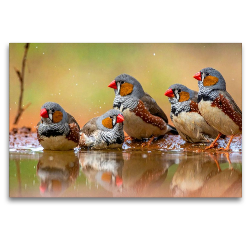 Entdecken Sie die quirrlige Welt der Zebrafinken in diesem kunstvoll gestalteten Bild. Jedes Detail wurde mithilfe moderner KI kreativ erzeugt, sodass die Szene voller Farben, Bewegung und Charme steckt. Die kleinen Schwarmvögel scheinen fast lebendig zu sein, während sie durch Gras, Sand oder unter australischem Himmel fliegen. Ein faszinierendes Motiv für Tierliebhaber, Naturliebhaber oder alle, die Freude an lebendigen, originellen Motiven haben.
